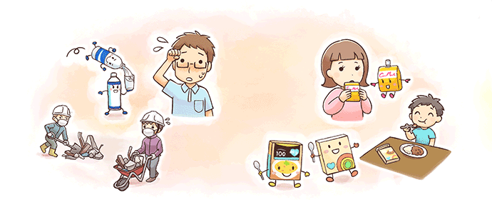 災害時に食材の確保が困難になり、食事が主食に偏ると、タンパク質、ビタミン、ミネラル等が不足しがちになり、体調不良につながることもあります。また、朝食を抜くことは、熱中症リスクを高める一因にもなります。食欲がない時や食事確保が困難な時には、手軽にエネルギーや栄養素を補給できる栄養補助食品なども積極的に利用し、「しっかりと食べる」意識を持ちましょう。
